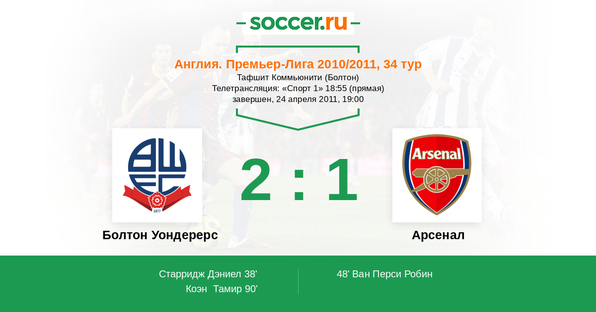 Англия. Премьер-Лига 17.01.2010 Болтон Уондерерс Логотип футбольный клуб Болтон Уондерерс 0:2 Логотип футбольный клуб Арсенал (Лондон) Арсенал