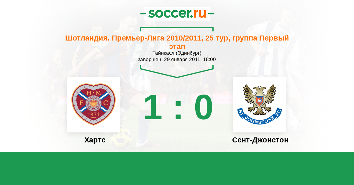 Шотландия. Премьер-Лига 13.11.2010 Сент-Джонстон Логотип футбольный клуб Сент-Джонстон (Перт) 0:2 Логотип футбольный клуб Хартс (Эдинбург) Хартс