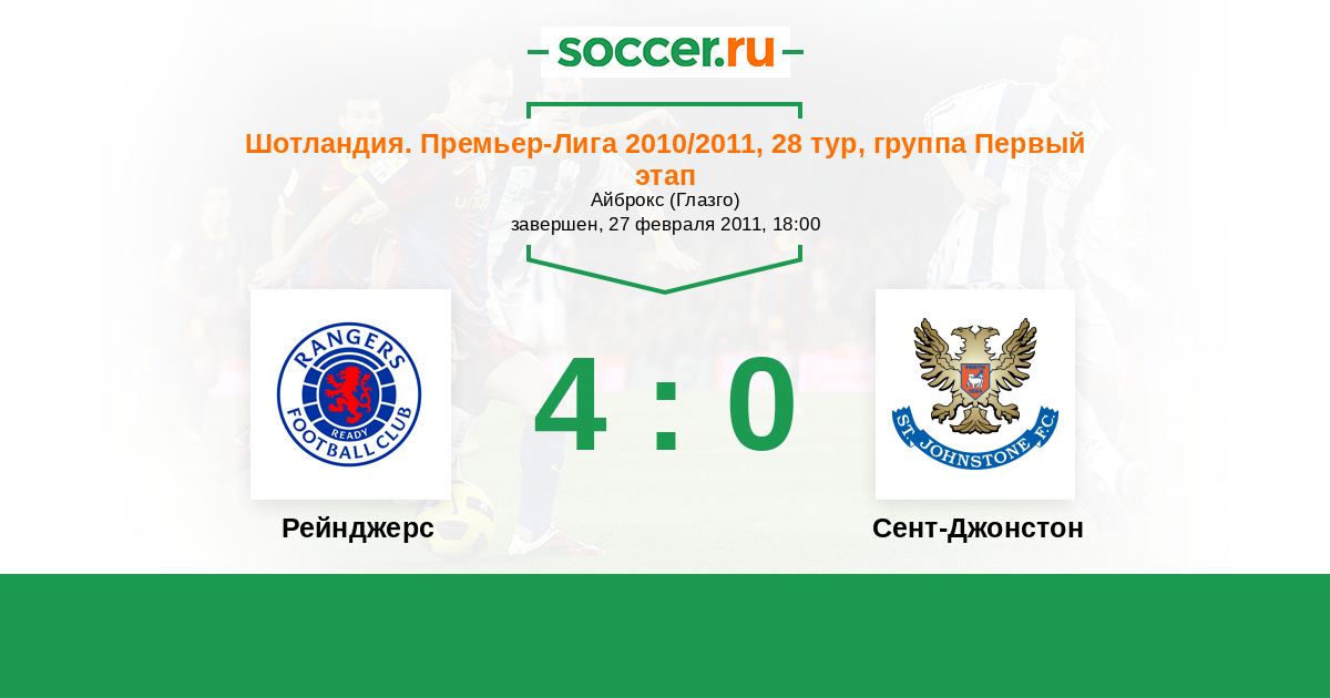 Шотландия. Премьер-Лига 05.04.2011 Сент-Джонстон Логотип футбольный клуб Сент-Джонстон (Перт) 0:2 Логотип футбольный клуб Рейнджерс (Глазго) Рейнджерс
