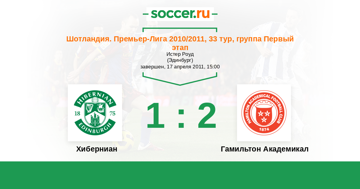 Шотландия. Премьер-Лига 01.03.2011 Гамильтон Академикал Логотип футбольный клуб Гамильтон Академикал 1:2 Логотип футбольный клуб Хиберниан (Эдинбург) Хиберниан