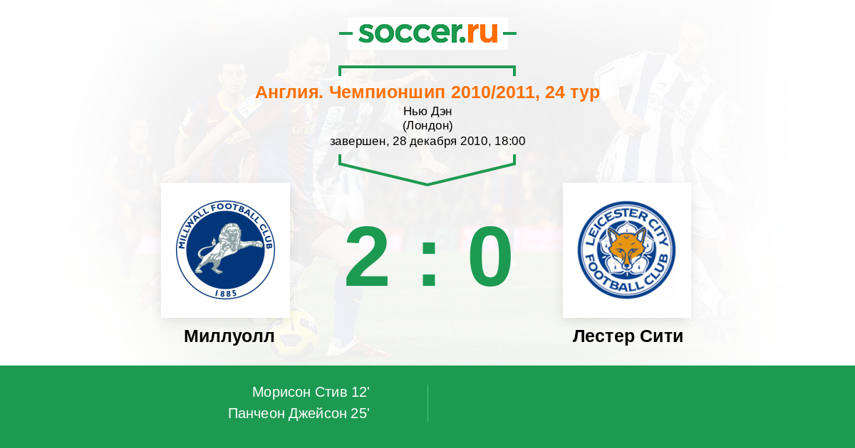 Англия. Чемпионшип 22.01.2011 Лестер Сити Логотип футбольный клуб Лестер Сити 4:2 Логотип футбольный клуб Миллуолл (Лондон) Миллуолл