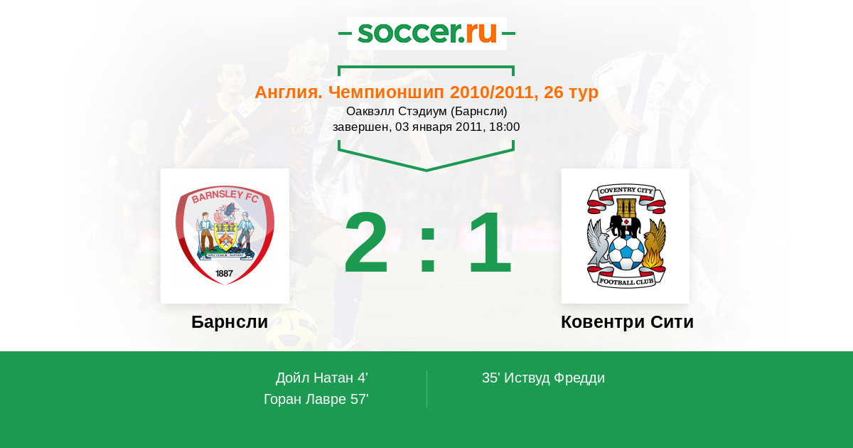 Англия. Чемпионшип 01.10.2011 Барнсли Логотип футбольный клуб Барнсли 2:0 Логотип футбольный клуб Ковентри Сити Ковентри Сити