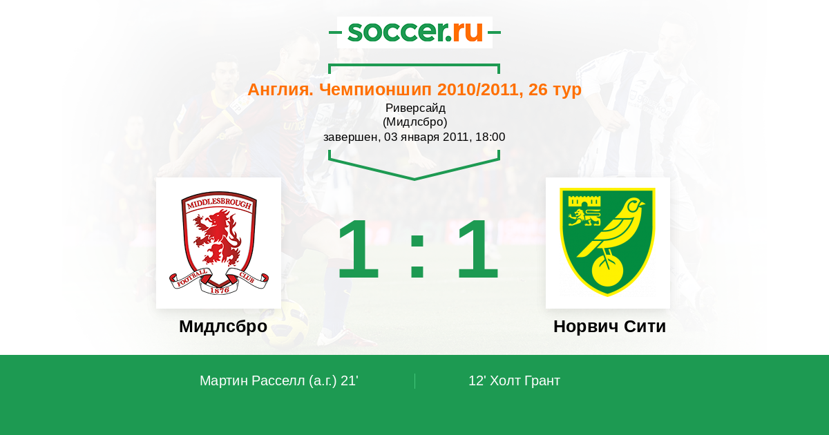 Англия. Чемпионшип 23.10.2010 Норвич Сити Логотип футбольный клуб Норвич Сити 1:0 Логотип футбольный клуб Мидлсбро Мидлсбро