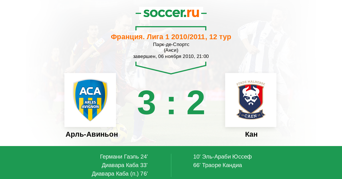 Франция. Лига 1 20.03.2011 Кан Логотип футбольный клуб Кан 2:0 Логотип футбольный клуб Арль-Авиньон Арль-Авиньон
