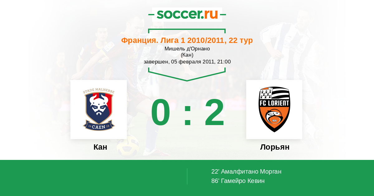 Франция. Лига 1 18.09.2010 Лорьян Логотип футбольный клуб Лорьян 0:1 Логотип футбольный клуб Кан Кан