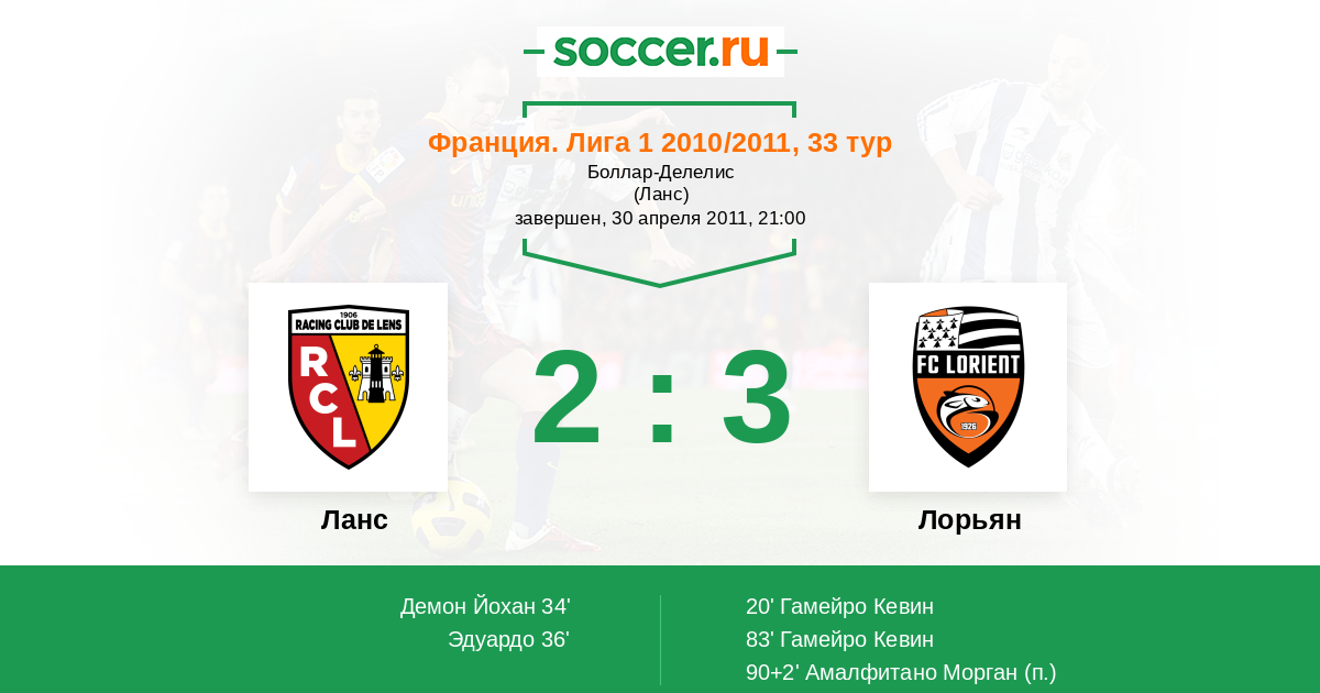 Франция. Лига 1 11.12.2010 Лорьян Логотип футбольный клуб Лорьян 3:0 Логотип футбольный клуб Ланс Ланс