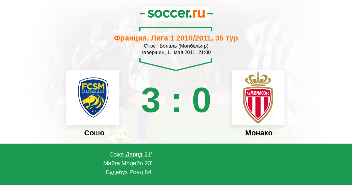 Франция. Лига 1 22.12.2010 Монако Логотип футбольный клуб Монако 2:1 Логотип футбольный клуб Сошо (Монбельяр) Сошо