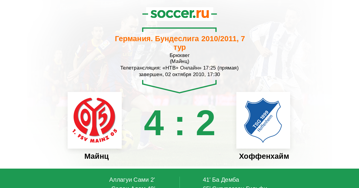 Германия. Бундеслига 10.09.2011 Майнц Логотип футбольный клуб Майнц 0:4 Логотип футбольный клуб Хоффенхайм (Зинсхайм) Хоффенхайм