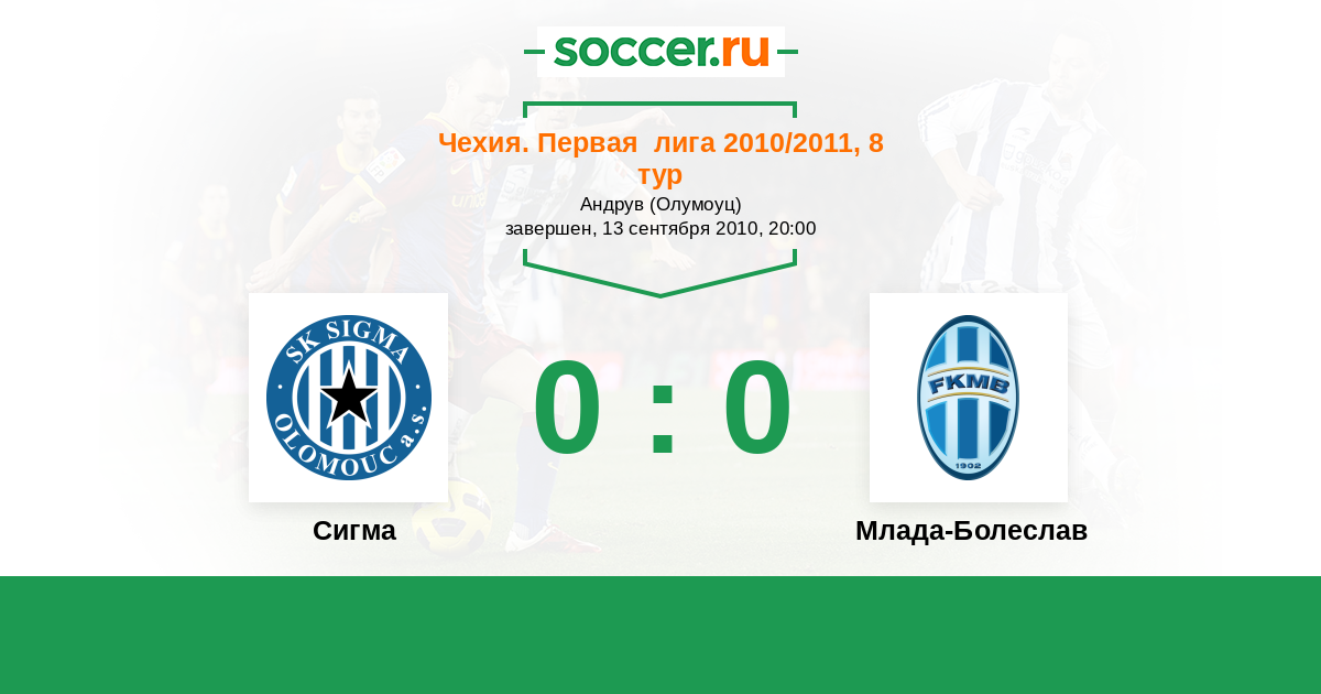 Чехия. Первая Лига 24.03.2010 Сигма Логотип футбольный клуб Сигма (Оломоуц) 1:2 Логотип футбольный клуб Млада-Болеслав Млада-Болеслав