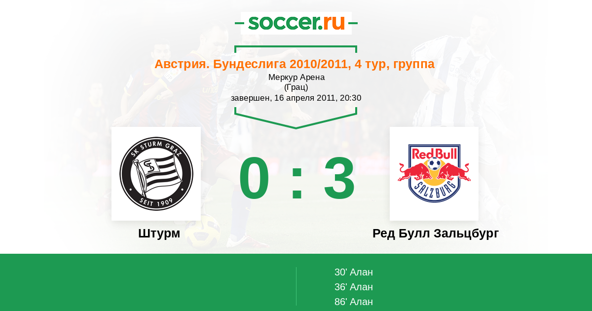 Австрия. Бундеслига 24.03.2010 Ред Булл Зальцбург Логотип футбольный клуб Ред Булл Зальцбург 3:0 Логотип футбольный клуб Штурм (Грац) Штурм
