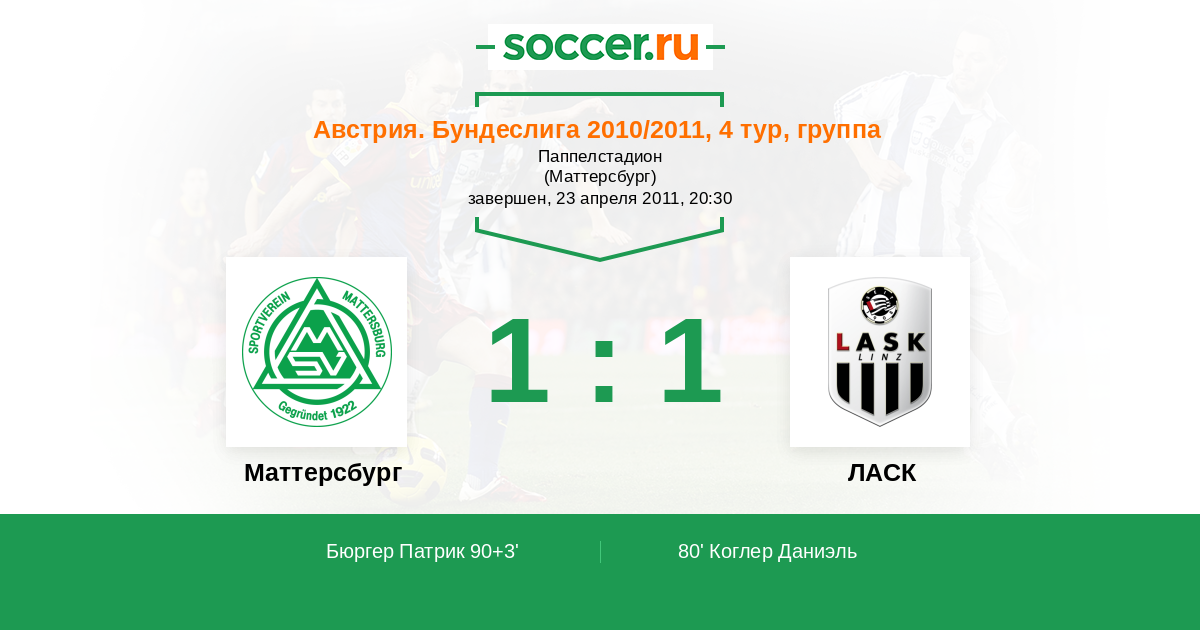 Австрия. Бундеслига 25.09.2010 Маттерсбург Логотип футбольный клуб Маттерсбург 3:3 Логотип футбольный клуб ЛАСК (Линц) ЛАСК
