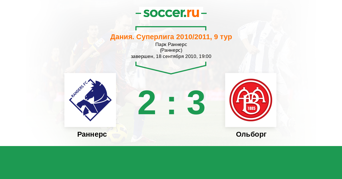 Дания. Суперлига 30.10.2010 Раннерс Логотип футбольный клуб Раннерс 0:0 Логотип футбольный клуб Ольборг Ольборг