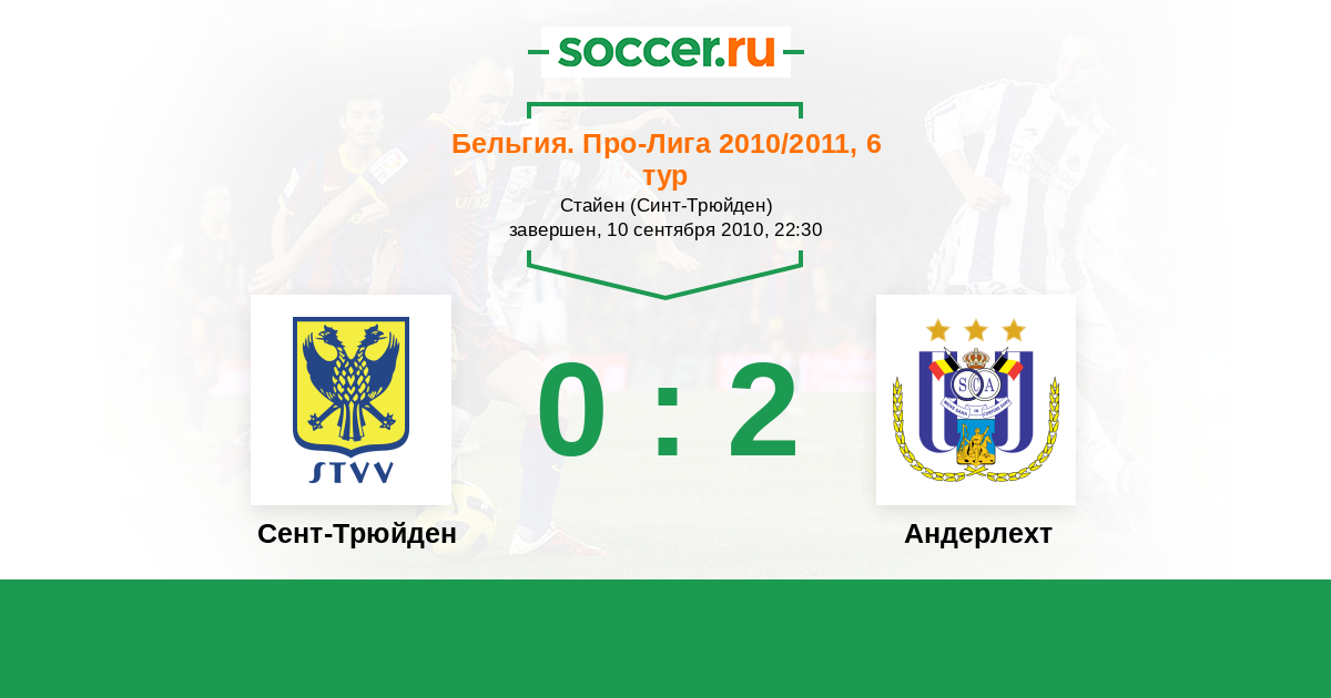 Бельгия. Про-Лига 05.02.2011 Андерлехт Логотип футбольный клуб Андерлехт (Брюссель) 2:0 Логотип футбольный клуб Сент-Трюйден (Синт-Трёйден) Сент-Трюйден