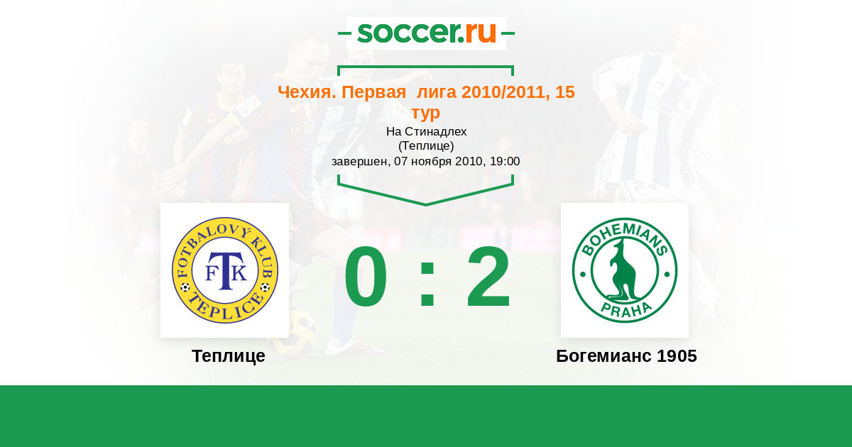 Чехия. Первая Лига 28.03.2010 Богемианс 1905 Логотип футбольный клуб Богемианс 1905 (Прага) 1:1 Логотип футбольный клуб Теплице Теплице