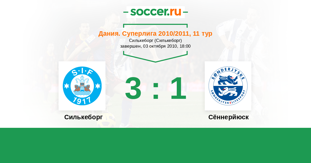 Дания. Суперлига 31.10.2010 Сённерйюск Логотип футбольный клуб Сённерйюск (Хадерслев) 1:2 Логотип футбольный клуб Силькеборг Силькеборг