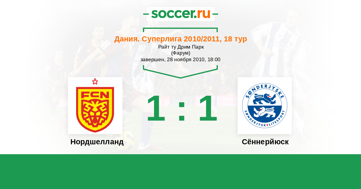 Дания. Суперлига 20.11.2011 Нордшелланд Логотип футбольный клуб Нордшелланд (Фарум) 2:0 Логотип футбольный клуб Сённерйюск (Хадерслев) Сённерйюск