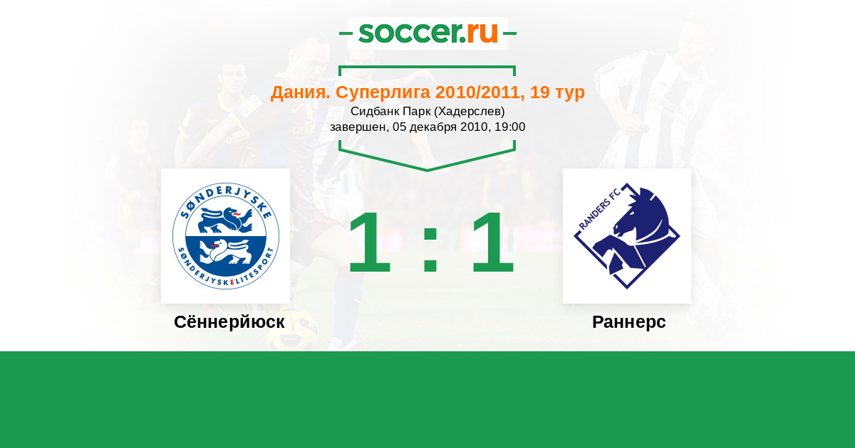 Дания. Суперлига 29.08.2010 Раннерс Логотип футбольный клуб Раннерс 0:0 Логотип футбольный клуб Сённерйюск (Хадерслев) Сённерйюск