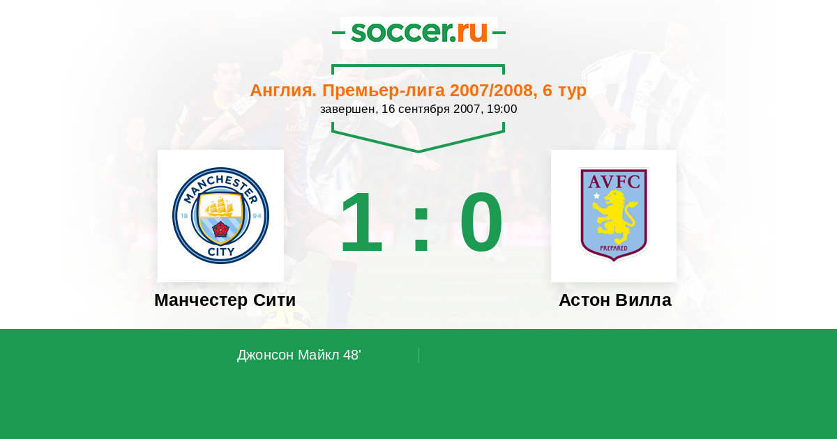 Англия. Премьер-Лига 28.04.2007 Манчестер Сити Логотип футбольный клуб Манчестер Сити 0:2 Логотип футбольный клуб Астон Вилла (Бирмингем) Астон Вилла