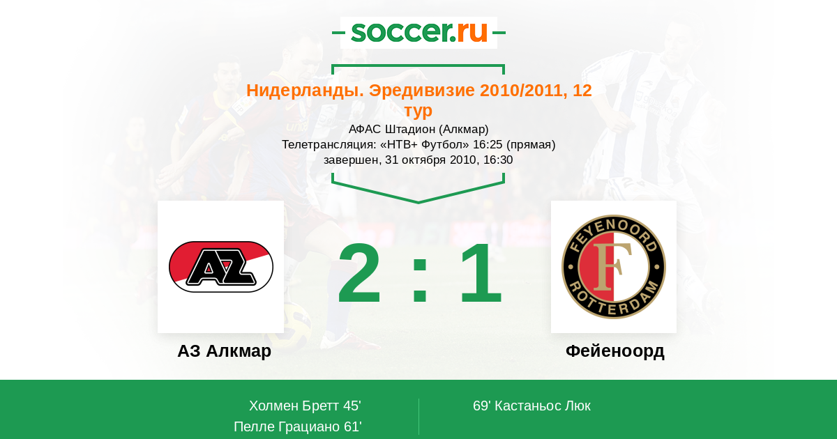 Нидерланды. Эредивизи 02.04.2011 Фейеноорд Логотип футбольный клуб Фейеноорд (Роттердам) 0:1 Логотип футбольный клуб АЗ Алкмар АЗ Алкмар