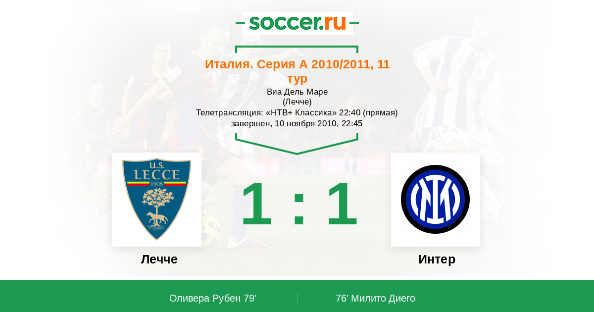 Италия. Серия А 20.03.2011 Интер Логотип футбольный клуб Интер (Милан) 1:0 Логотип футбольный клуб Лечче Лечче