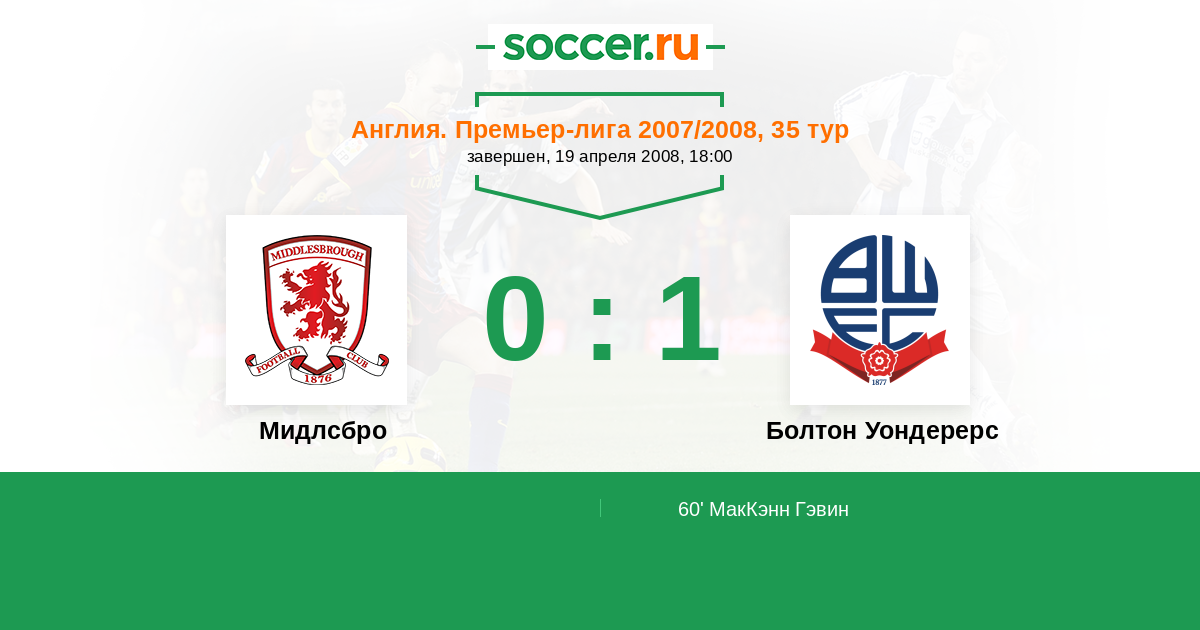 Англия. Премьер-Лига 04.04.2009 Болтон Уондерерс Логотип футбольный клуб Болтон Уондерерс 4:1 Логотип футбольный клуб Мидлсбро Мидлсбро