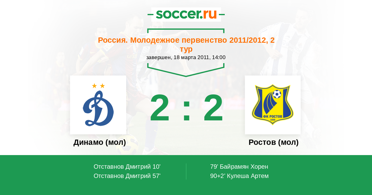 Россия. Премьер-Лига U21 05.11.2010 Ростов (мол) Логотип футбольный клуб Ростов (мол) (Ростов-на-Дону) 2:0 Логотип футбольный клуб Динамо (мол) (Москва) Динамо (мол)