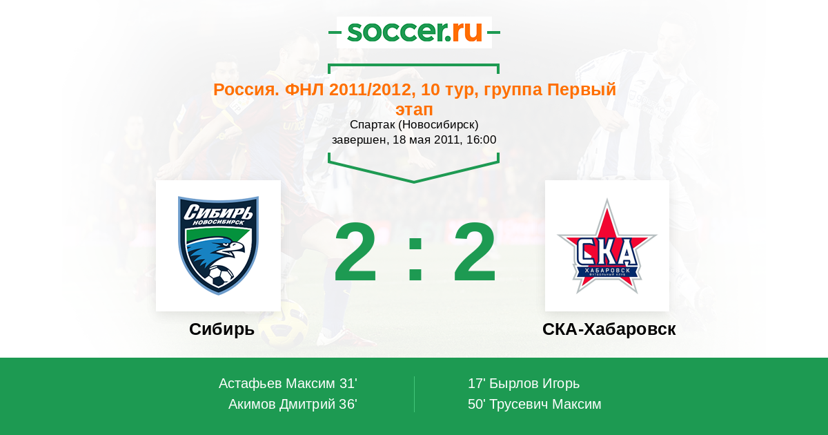 Россия. Первая лига 30.04.2013 Сибирь Логотип футбольный клуб Сибирь (Новосибирск) 1:0 Логотип футбольный клуб СКА-Энергия (Хабаровск) СКА-Энергия