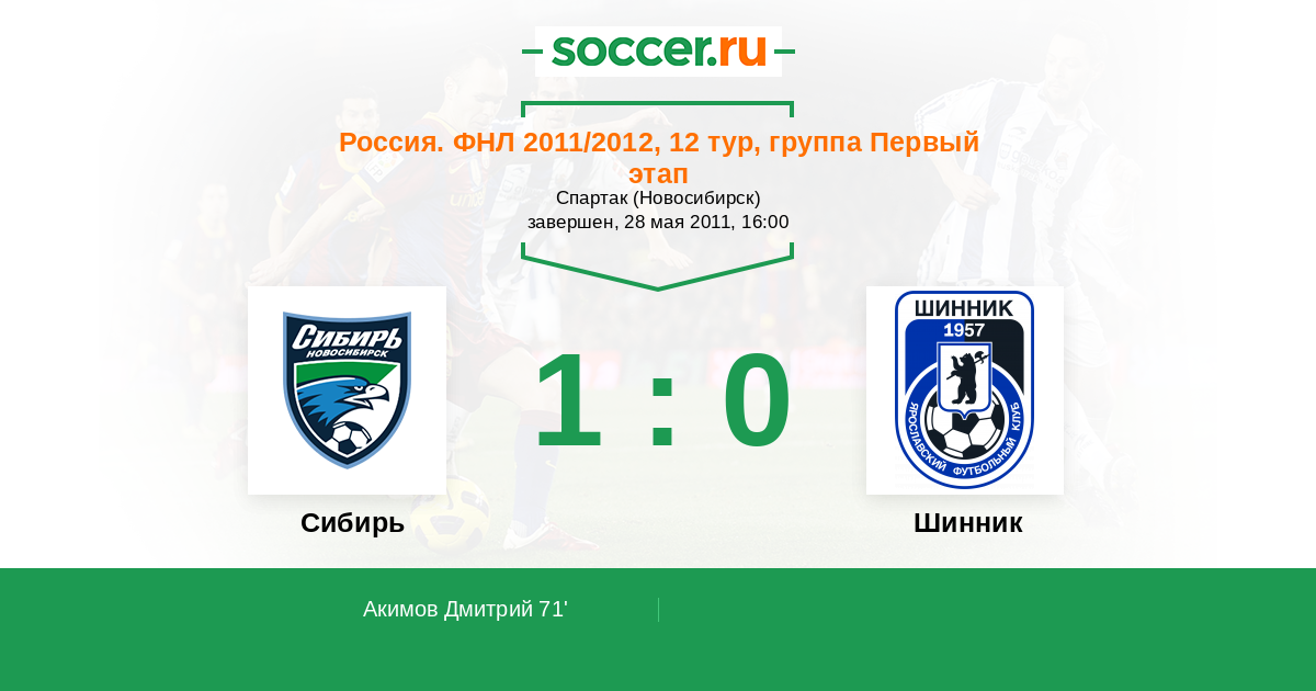 Россия. Первая лига 11.04.2012 Сибирь Логотип футбольный клуб Сибирь (Новосибирск) 1:1 Логотип футбольный клуб Шинник (Ярославль) Шинник