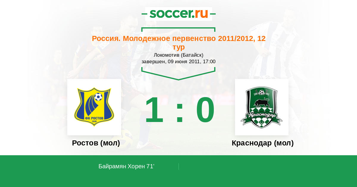 Россия. Премьер-Лига U21 14.10.2011 Краснодар (мол) Логотип футбольный клуб Краснодар (мол) 4:0 Логотип футбольный клуб Ростов (мол) (Ростов-на-Дону) Ростов (мол)