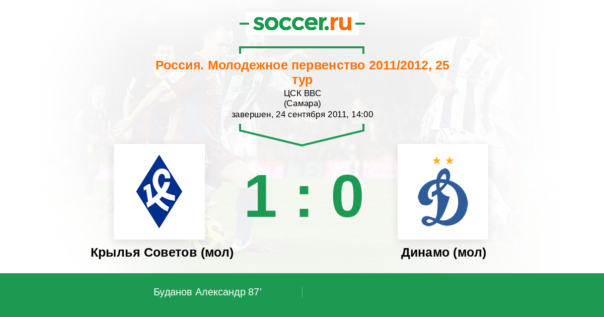 Россия. Премьер-Лига U21 20.05.2011 Динамо (мол) Логотип футбольный клуб Динамо (мол) (Москва) 4:0 Логотип футбольный клуб Крылья Советов (мол) (Самара) Крылья Советов (мол)