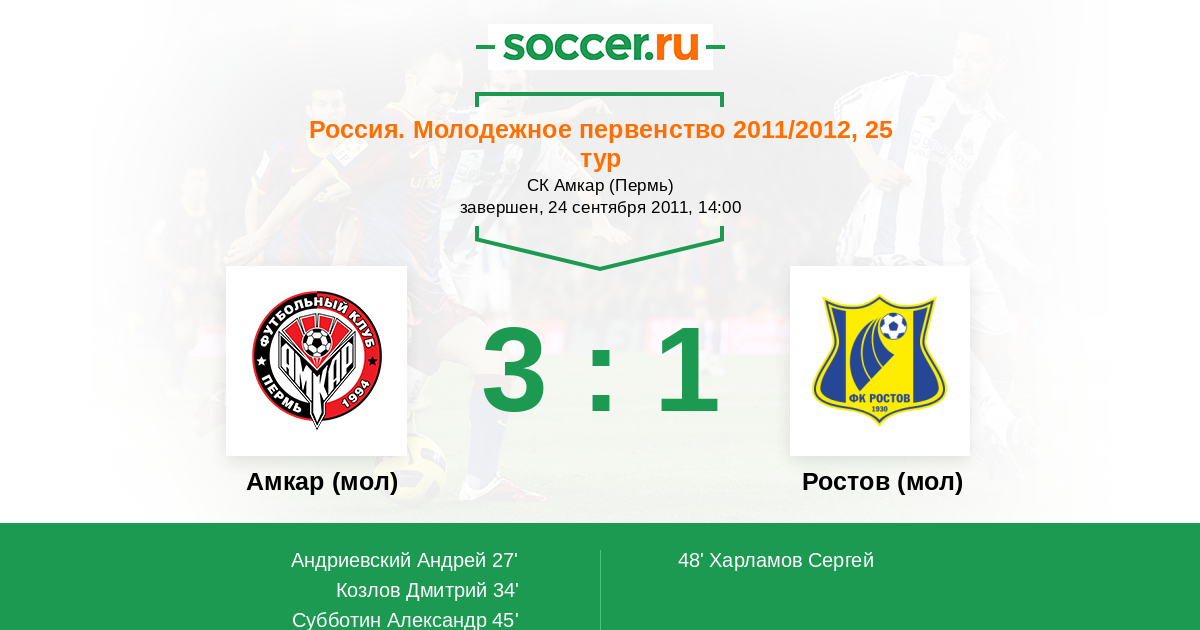 Россия. Премьер-Лига U21 06.04.2012 Амкар (мол) Логотип футбольный клуб Амкар (мол) (Пермь) 1:2 Логотип футбольный клуб Ростов (мол) (Ростов-на-Дону) Ростов (мол)