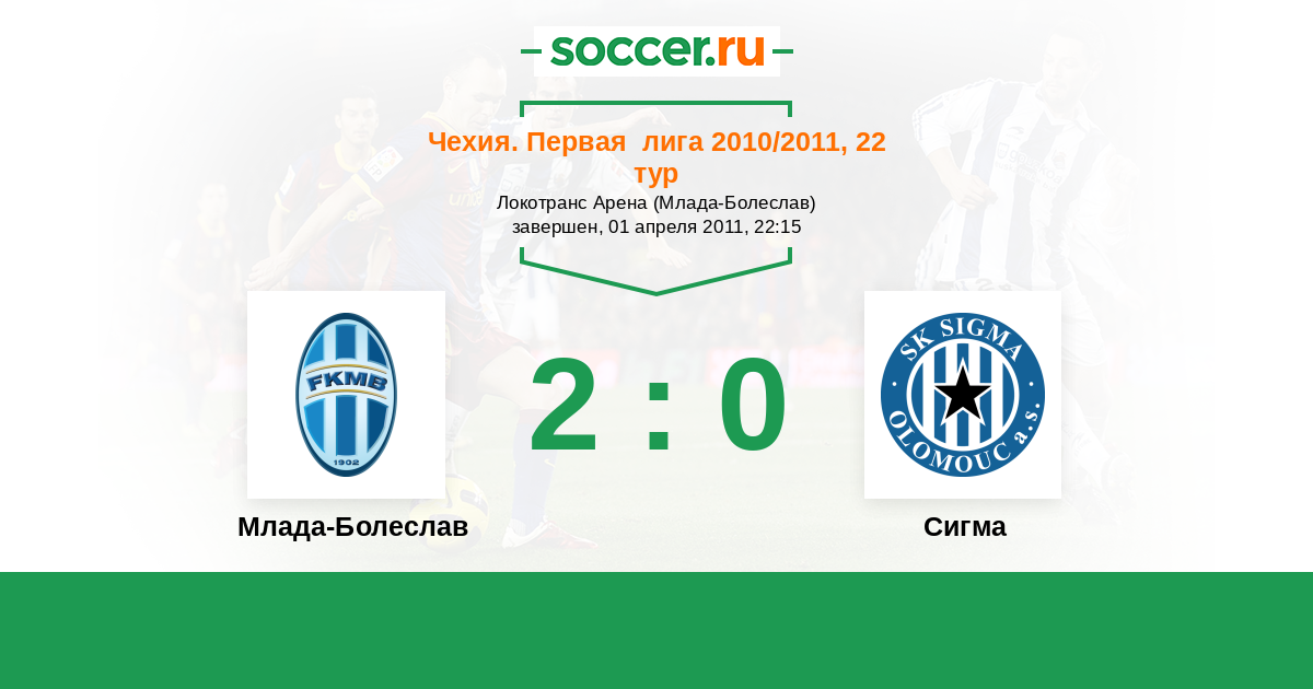 Чехия. Первая Лига 24.03.2010 Сигма Логотип футбольный клуб Сигма (Оломоуц) 1:2 Логотип футбольный клуб Млада-Болеслав Млада-Болеслав