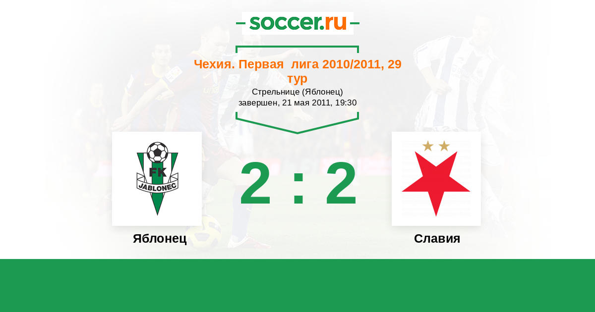 Чехия. Первая Лига 08.05.2010 Славия Логотип футбольный клуб Славия (Прага) 0:3 Логотип футбольный клуб Яблонец (Яблонец-над-Нисоу) Яблонец