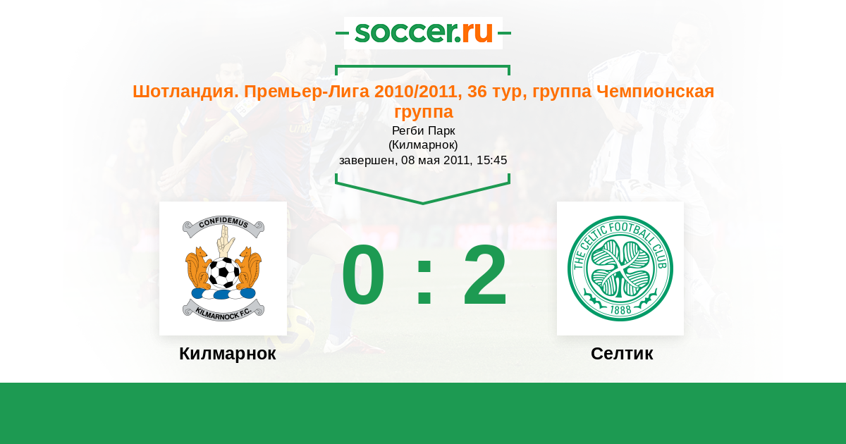 Шотландия. Премьер-Лига 20.04.2011 Килмарнок Логотип футбольный клуб Килмарнок 0:4 Логотип футбольный клуб Селтик (Глазго) Селтик