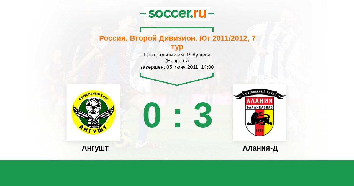 Россия. Вторая лига. Группа 1 09.10.2011 Алания-Д Логотип футбольный клуб Алания-Д (Владикавказ) 1:3 Логотип футбольный клуб Ангушт (Назрань) Ангушт