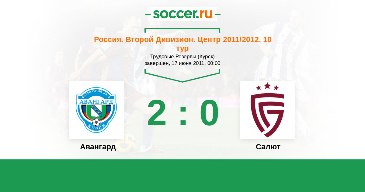 Россия. Первая лига 23.06.2010 Салют Логотип футбольный клуб Салют (Белгород) 0:0 Логотип футбольный клуб Авангард (Курск) Авангард