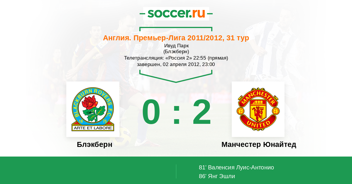 Англия. Премьер-Лига 31.12.2011 Манчестер Юнайтед Логотип футбольный клуб Манчестер Юнайтед 2:3 Логотип футбольный клуб Блэкберн Блэкберн