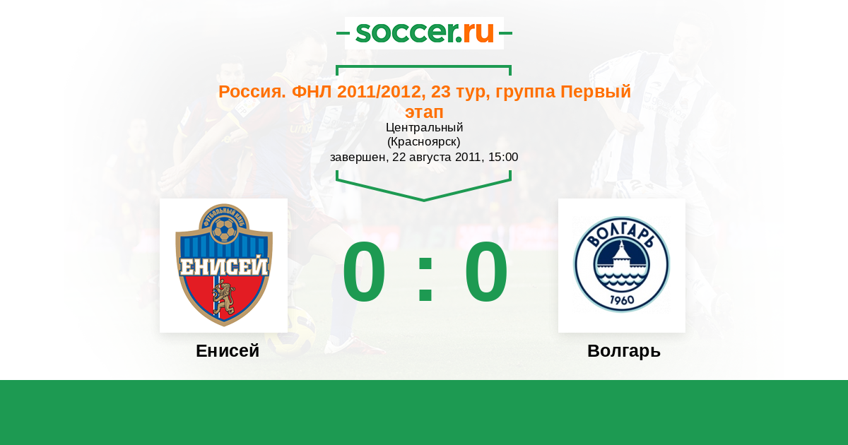 Россия. Первая лига 22.08.2012 Енисей Логотип футбольный клуб Енисей (Красноярск) 0:0 Логотип футбольный клуб Волгарь (Астрахань) Волгарь