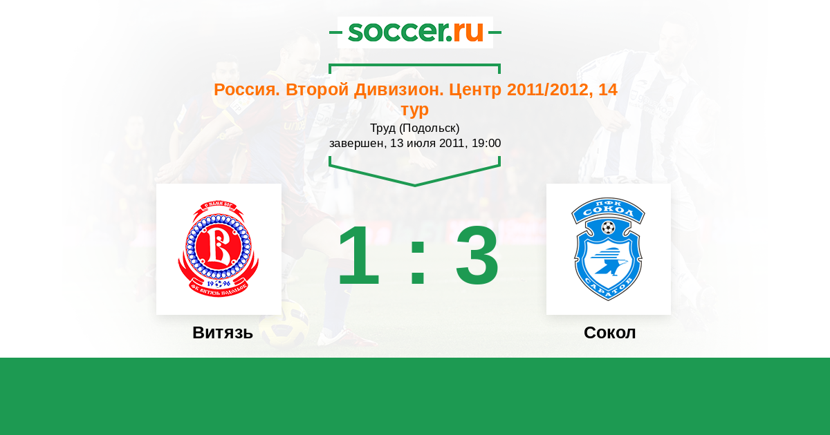 Россия. Вторая лига. Группа 3 21.07.2012 Витязь Логотип футбольный клуб Витязь (Подольск) 0:1 Логотип футбольный клуб Сокол (Саратов) Сокол