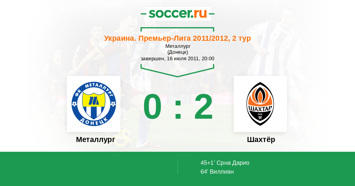 Украина. Суперкубок 10.07.2012 Шахтёр Логотип футбольный клуб Шахтёр (Донецк) 2:0 Логотип футбольный клуб Металлург (Донецк) Металлург