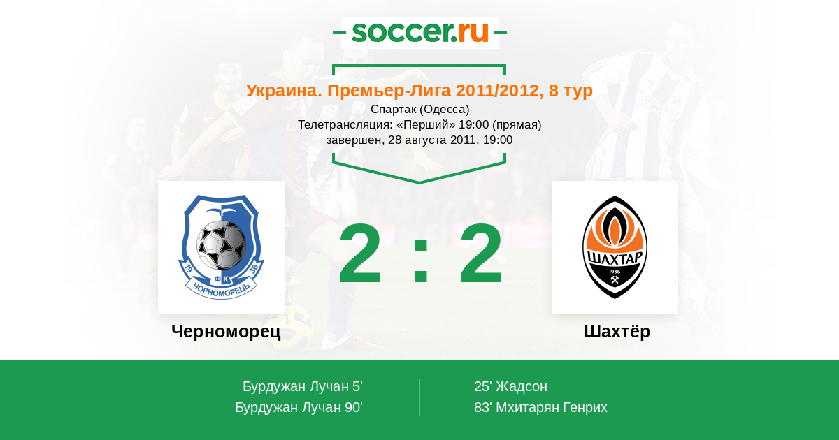Украина. Премьер-Лига 19.08.2012 Черноморец Логотип футбольный клуб Черноморец (Одесса) 1:5 Логотип футбольный клуб Шахтёр (Донецк) Шахтёр
