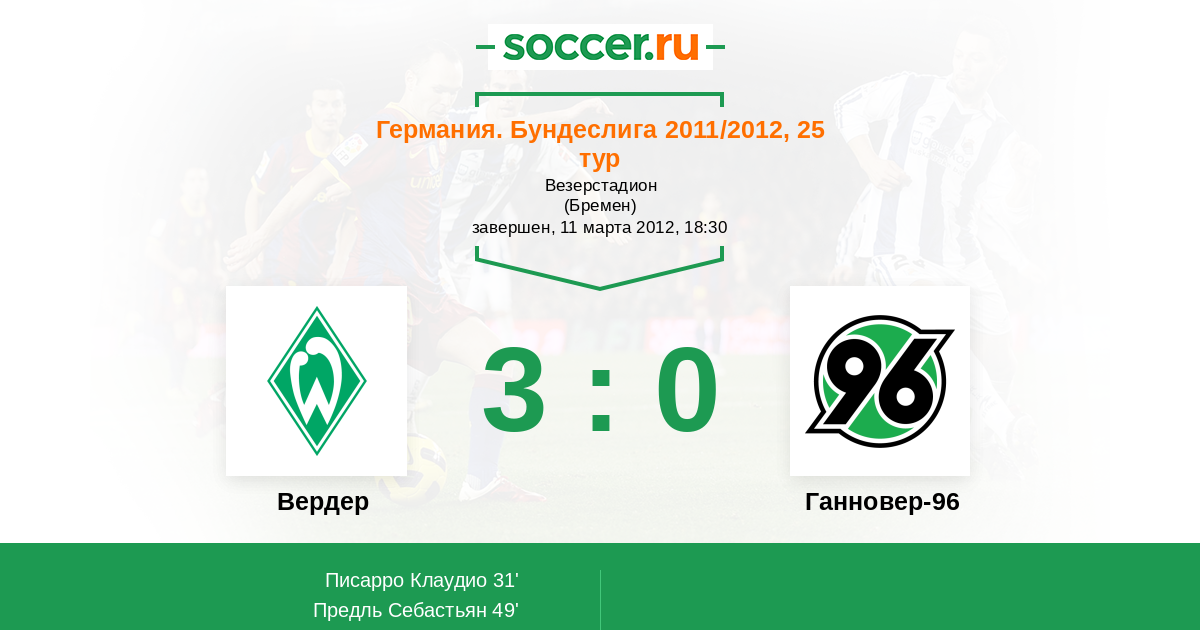 Германия. Бундеслига 13.02.2011 Вердер Логотип футбольный клуб Вердер (Бремен) 1:1 Логотип футбольный клуб Ганновер-96 Ганновер-96