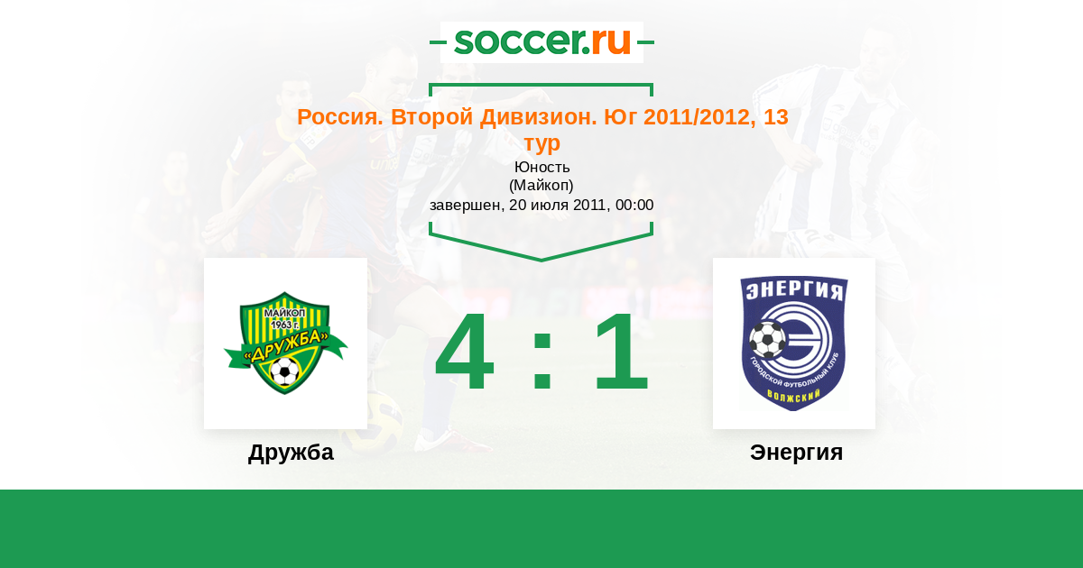 Россия. Вторая лига. Группа 1 21.07.2012 Дружба Логотип футбольный клуб Дружба (Майкоп) 1:2 Логотип футбольный клуб Энергия (Волжский) Энергия