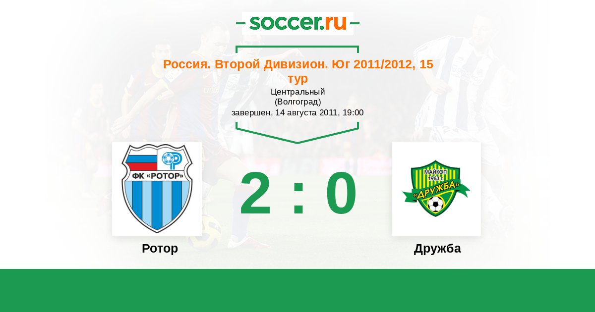 Россия. Вторая лига. Группа 1 13.05.2012 Дружба Логотип футбольный клуб Дружба (Майкоп) 0:0 Логотип футбольный клуб Ротор (Волгоград) Ротор