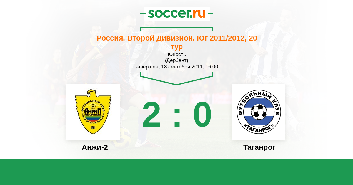 Россия. Вторая лига. Группа 1 01.10.2014 Анжи-2 Логотип футбольный клуб Анжи-2 (Махачкала) 1:0 Логотип футбольный клуб Таганрог Таганрог