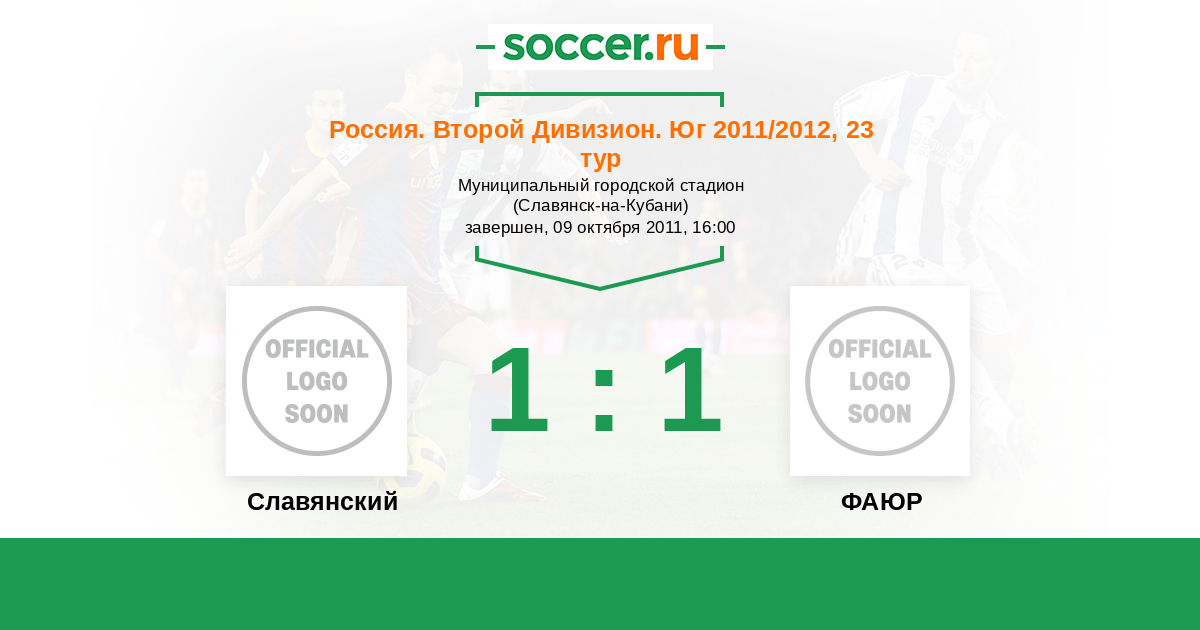 Россия. Вторая лига. Группа 1 05.06.2011 ФАЮР Логотип футбольный клуб ФАЮР (Беслан) 0:2 Логотип футбольный клуб Славянский (Славянск-на-Кубани) Славянский