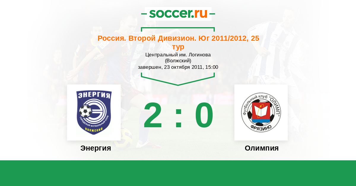 Россия. Вторая лига. Группа 1 21.06.2011 Олимпия Логотип футбольный клуб Олимпия (Геленджик) 2:1 Логотип футбольный клуб Энергия (Волжский) Энергия