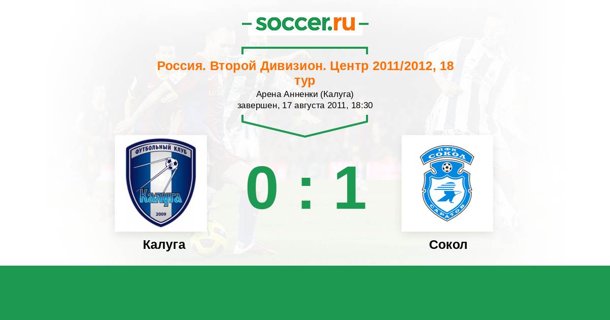 Россия. Вторая лига. Группа 3 14.09.2012 Калуга Логотип футбольный клуб Калуга 0:0 Логотип футбольный клуб Сокол (Саратов) Сокол