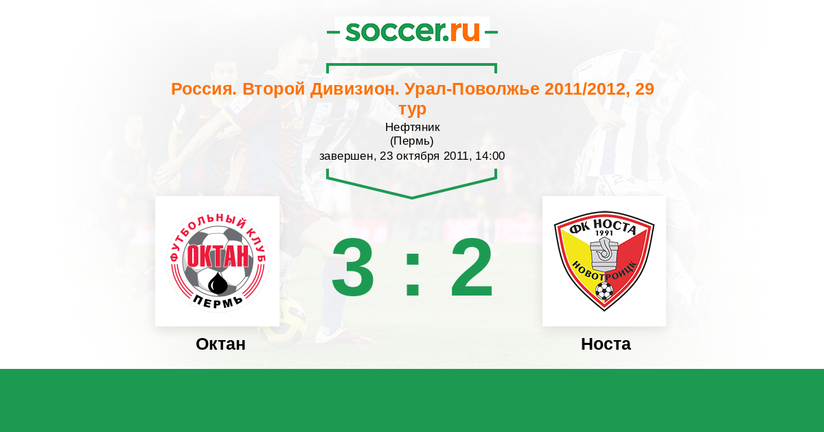 Россия. Вторая лига. Группа 4 24.08.2012 Носта Логотип футбольный клуб Носта (Новотроицк) 3:0 Логотип футбольный клуб Октан (Пермь) Октан