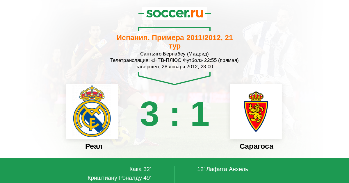 Испания. Примера 28.08.2011 Сарагоса Логотип футбольный клуб Сарагоса 0:6 Логотип футбольный клуб Реал (Мадрид) Реал